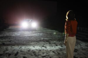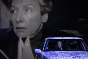 Apparaît Valéria, maîtresse du développement personnel et vendeuse de rêve, puis Carolina, qui le taraude sur le droit des animaux et se découvre comme camarade de classe aussi. Entre temps, la voiture calcinée est remorquée. Amor qui était dans la ville à la recherche d’une mèche de perceuse pour sa sœur se sent en insécurité, déstabilisé car culpabilisé dès qu’il croise des policiers. La peur s’installe « dans notre deuxième pays » comme autant de caméras de surveillance dont les images remplissent les écrans, les pensées se télescopent, la folie monte. La guerre est dans les têtes. Amor se voit tuer les policiers et leurs chiens et raconte, tendu à l’extrême, couché sur la neige. Tournant sur lui-même, ses pieds dessinent les lettres de l’alphabet arabe. L’image en noir et blanc rapportée sur écran est belle, la solitude est là. La scène finale convoque une autre vision, sa grand-mère, dans sa part de simplicité et d’humanité. Face à elle, les temps se réfractent et se mêlent : « J’ai vingt-deux ans. J’ai cinquante-cinq ans… Tout me manque… » L’esprit de sa grand-mère, image sur écran et jeu sur scène. « Je t’ai suivi toute la journée, dit-elle. Il faut que tu rentres chez toi. Tu n’es pas seul, je suis là. » Dernier appel avec Shavi qui lui dit : « Je t’ai cherché… T’as entendu les explosions ? On s’appelle demain… » Et Amor le rappelant, l’implore de venir. « Attends-moi là mon frère… » lui répond Shavi qui arrive, l’amitié en bandoulière. Dans les phares de la voiture « j’ai vu un type, et ce type, c’était moi ! Mon propre reflet dans la vitre. »