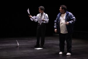 On entre dans un dispositif bi-frontal au bout duquel, de part et d’autre se trouve un écran. Christophe Rauck, metteur en scène, spatialise ainsi le diptyque qu’il propose sous le titre Presque égal, presque frère, en rassemblant deux pièces de l’auteur suédois Jonas Hassen Khemiri : Presque égal à et J’appelle mes frères, qui traversent plusieurs temporalités. Le dispositif scénographique est signé Simon Restino, il permet aux acteurs de se mêler au public pour le prendre à témoin, la création lumière d’Olivier Oudiou construit des atmosphères.