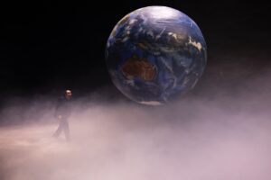 Dans la première pièce, Presque égal à, s’entrelacent des parcours qui marquent de grands écarts entre ceux qui possèdent et ceux qui n’ont rien. On entre dans la galaxie de l’économie et du rendement. « Je tombe » dit le premier acteur déjà au sol et se fondant à la poussière interstellaire d’où il voit la terre, vue du ciel. La galerie des portraits proposée par Christophe Rauck nous mène, dans une certaine distance humoristique, du XVIIIème siècle avec la réussite de Casparus Van Houten le roi du chocolat, comme une apparition sur fond de clavecin, à la brutalité du monde d’aujourd’hui dessinée à grands traits : les petits boulots et les moyens de survie pour Peter le vrai-faux SDF ; la recherche d’emploi d’Andrej, fraîchement diplômé, plein de bonnes intentions et bientôt chez Pôle emploi rempli d’amertume, « à l’avenir ! » ; le brillant universitaire, Mani, polarisé sur ses connaissances et déconnecté, en attente de reconnaissance ; le rêve de Martina d’avoir une ferme bio, taraudée par son double qui lui souffle le chaud et le froid, disant tout haut ce qu’elle pense tout bas et qui écoute, hébétée, les recommandations de la coach, vraiment très coach, « que deviendriez -vous si vous suiviez votre voie (voix) ? Freya jeune licenciée, en short et chaussettes jaunes qui attend son heure ; Erica virée du tabac qui l’emploie ; le bonimenteur à la veste à paillettes et son étude de marché qui nous fait de l’œil et joue de vitesse sur patins à roulettes