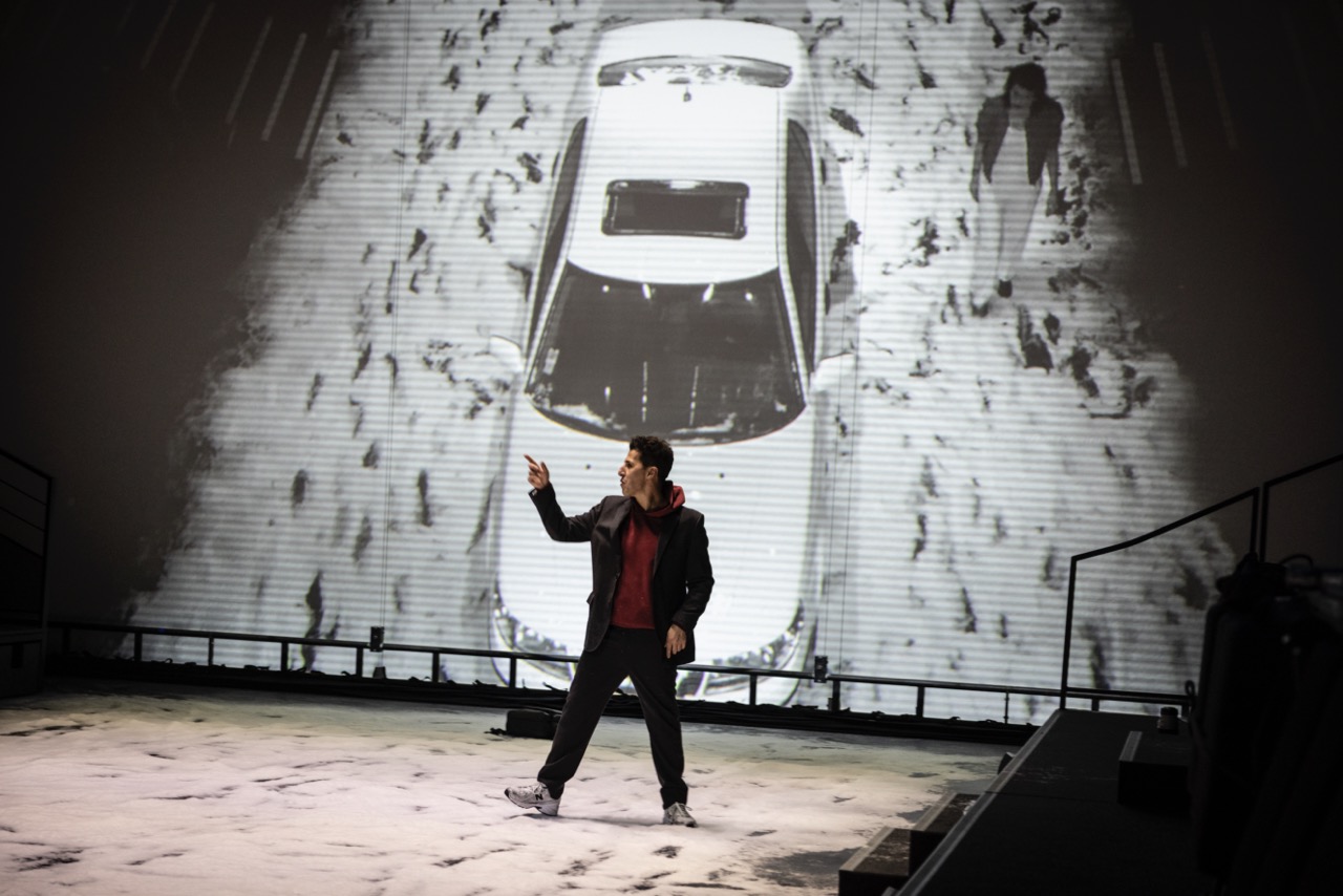 Et comme « le show doit continuer », après l’entracte et deux heures de spectacle, le public est convié à la seconde pièce, J’appelle mes frères, introduite par quelques notes de clavecin qui font le lien avec la première partie, comme l’esprit de la mise en scène et dans le même dispositif scénographique. Tirée du roman au nom éponyme, Jonas Hassen Khemiri, l’a écrite en 2012, en écho à l’attentat de Stockholm en 2010 qui se voulait être une réponse aux caricatures du Prophète. Il s’est aussi exprimé après l’attaque de Charlie-Hebdo à Paris, en 2015. La pièce met en scène un homme, Amor, que ses amis appellent après l’explosion d’une voiture piégée au centre-ville, acte terroriste commis par un Irakien, et qui sème la panique. Un paysage de neige, le sol est blanc, une voiture sur le côté – cour ou jardin, selon -. Les appels par mobile sont au cœur du sujet et le lien entre les personnages. Shavi, l’ami d’enfance nouvellement père, Valéria, Ahlem, Tyra, le bordent de recommandations contradictoires, et le mobile devient un personnage principal du récit. L’angoisse, les mises en garde et les mots de tendresse et de provocation fusent. Les ami(e)s prennent place dans cette voiture pour le haranguer, une caméra renvoie des images sur l’écran.