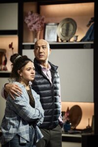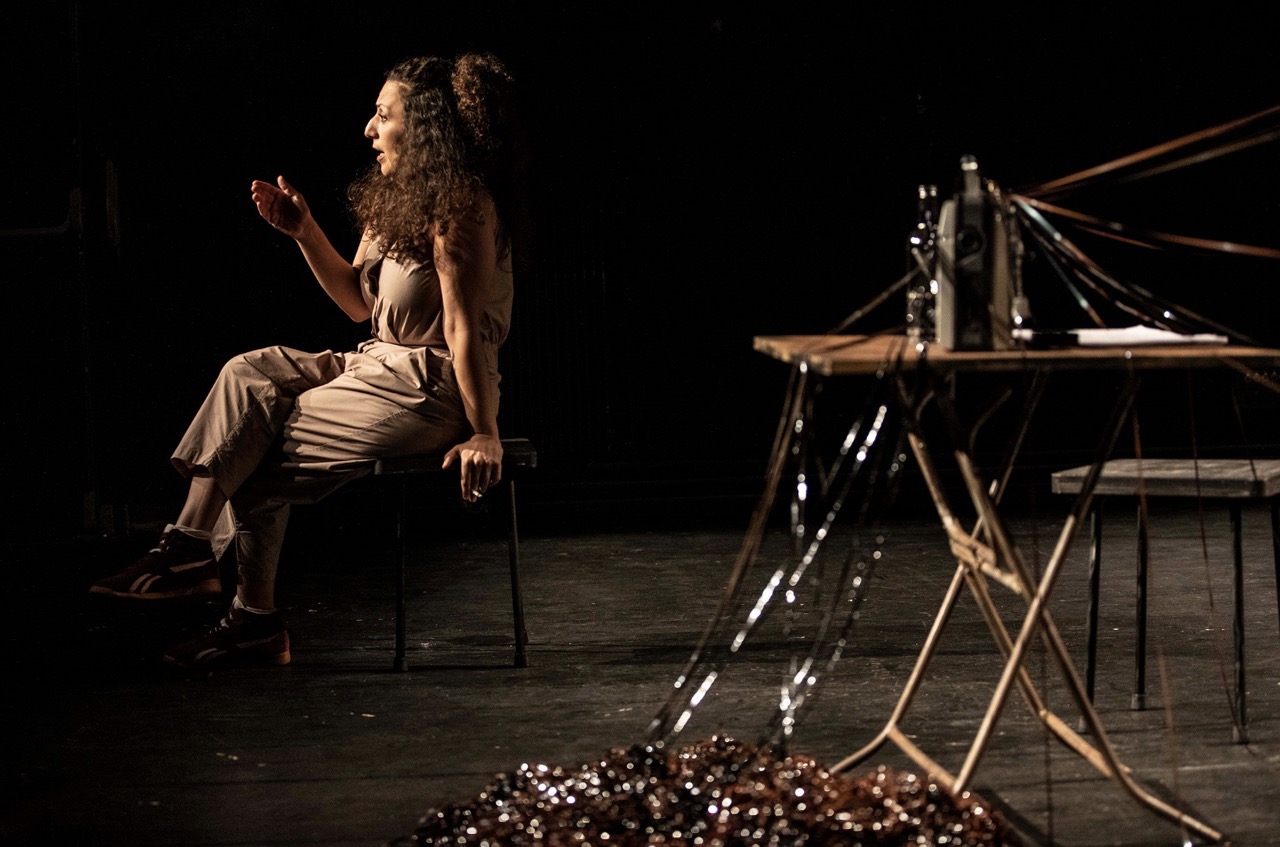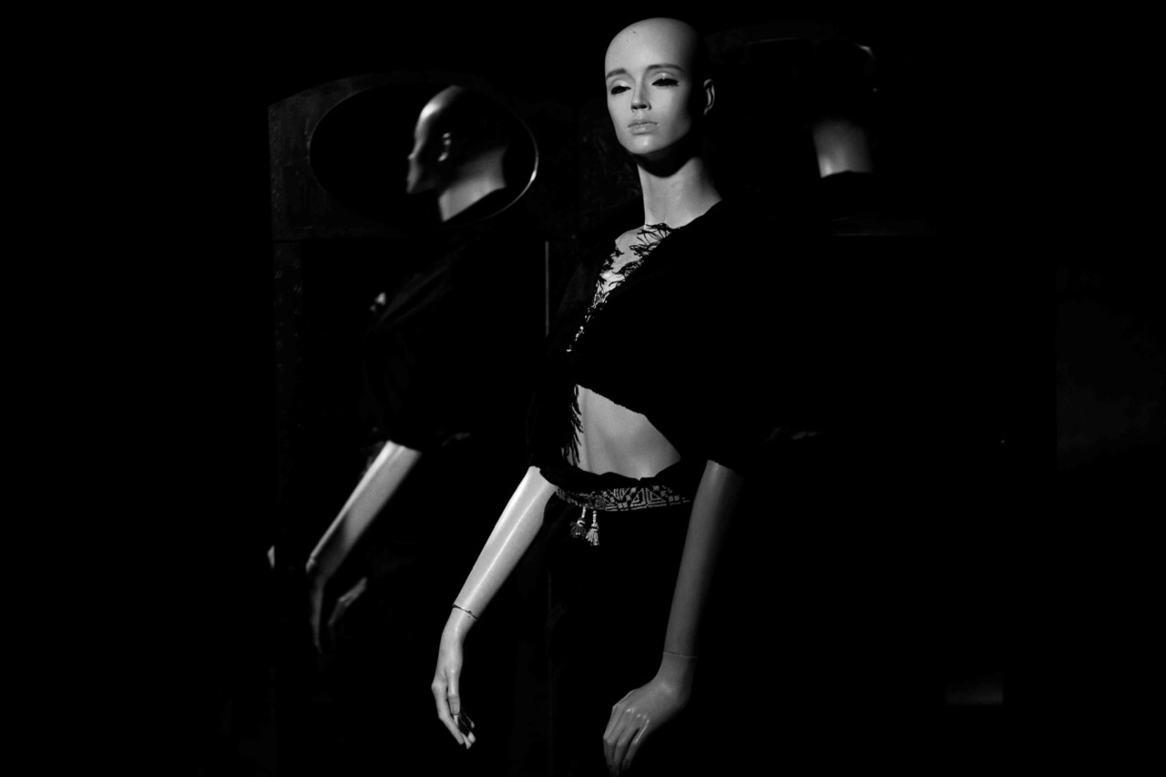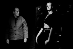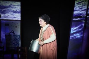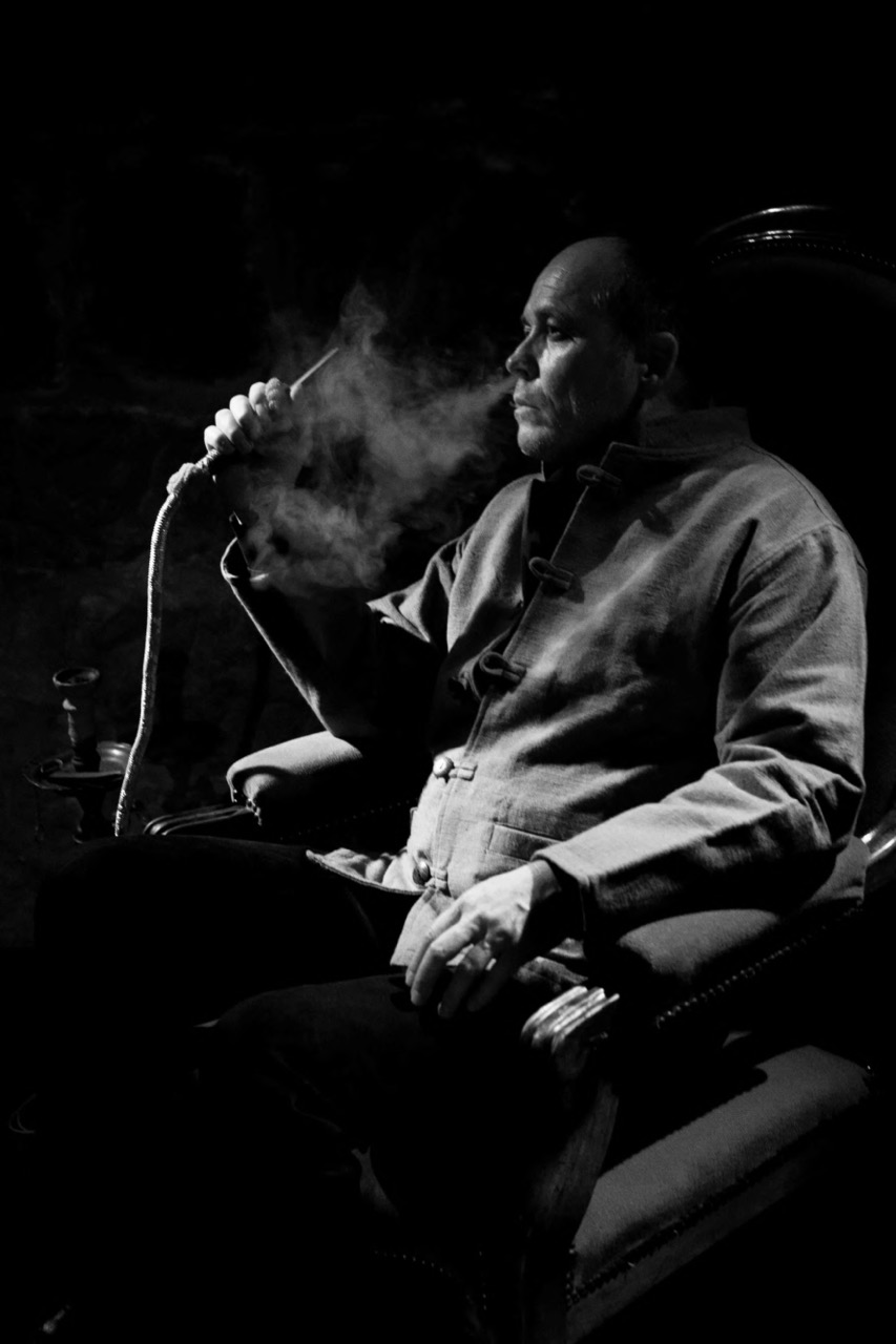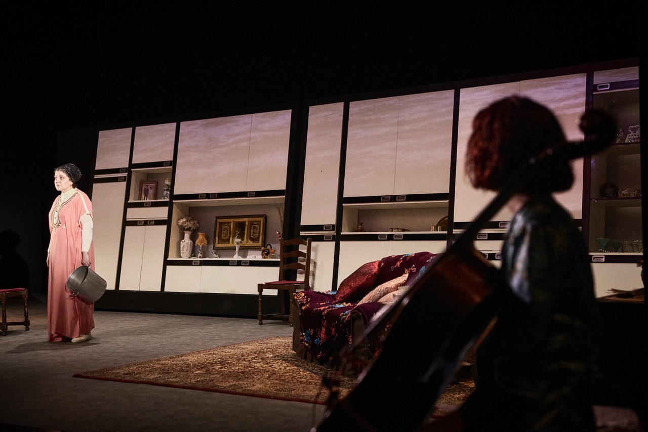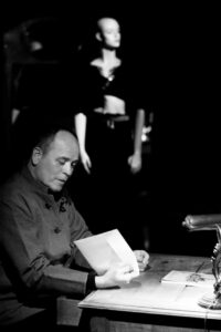 Sur le plateau, un fauteuil et un narguilé côté cour, la table de l’écrivain côté jardin. C’est avec Recueillement, qu’on entre de plain-pied dans le spectacle : « Sois sage, ô ma douleur, et tiens-toi plus tranquille. Tu réclamais le Soir ; il descend ; le voici : une atmosphère obscure enveloppe la ville, aux uns portant la paix, aux autres le souci. » Au centre et le cœur du sujet, un paravent clos et qui, quand il s’ouvre, révèle la Femme et son reflet. Mannequin de taille humaine, Elle, regarde le poète, droit dans les yeux.