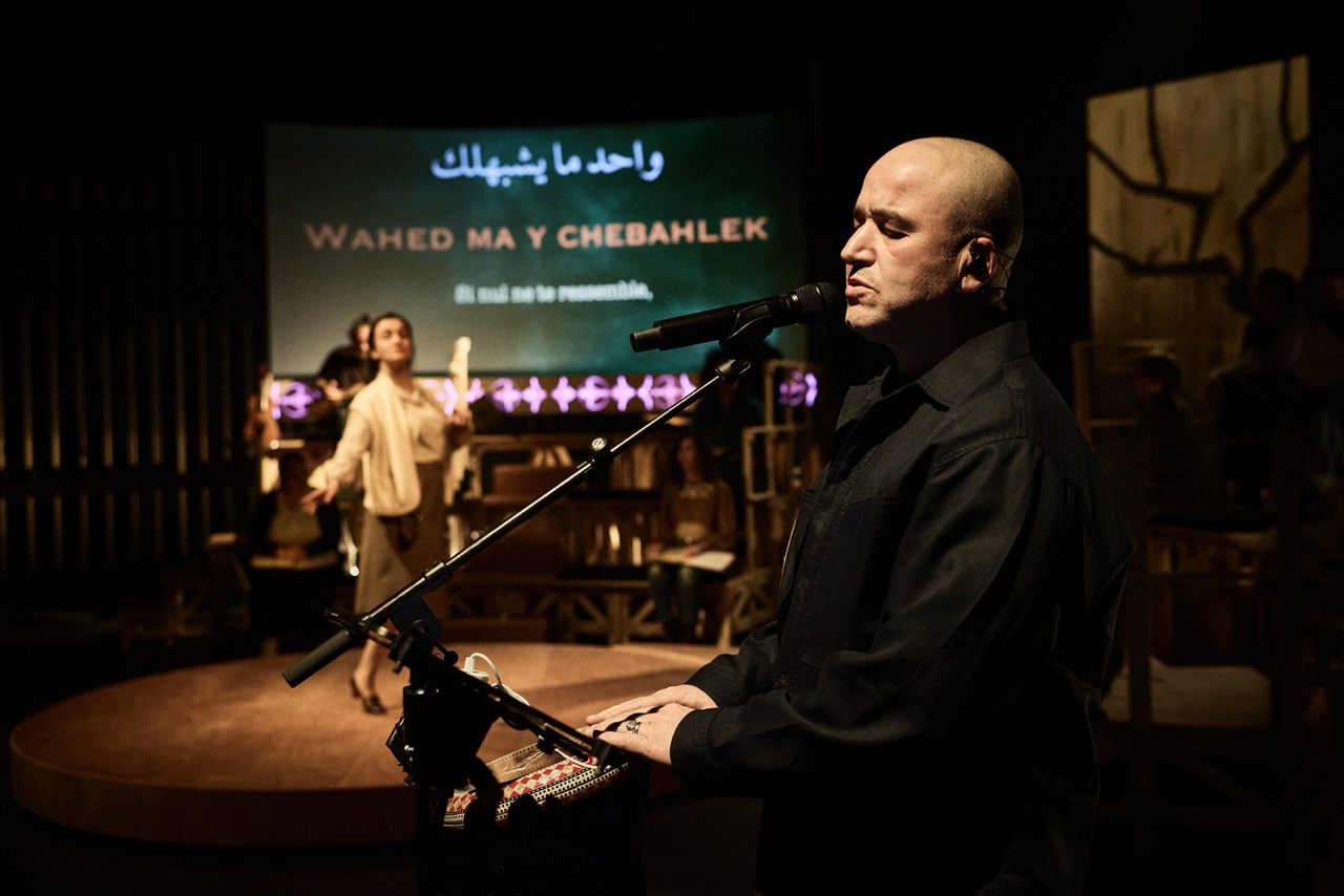 Ils apprennent aussi que la guerre entre frères ne fait pas Nation et que l’exil est « la terre du rêve » selon le grand poète palestinien Mahmoud Darwich. Les enfants apprennent leur pays par la langue et les chansons et quand ils questionnent leur professeure sur son départ du Liban elle répond : « J’ai emporté la langue et mes livres. » Elle se présente comme chrétienne maronite quand on le lui demande, dans un pays où cohabitent de nombreuses communautés. Les chansons se font entendre sur scène au fil du spectacle, interprétées par Abdelwaheb Sefsaf accompagné du talentueux musicien Aliocha Regnard, violoniste de formation spécialisé dans les musiques improvisées et jouant du nyckelharpa un instrument à archet sur lequel la main gauche détermine la hauteur des notes par un clavier muni de touches. La composition musicale est signée Georges Baux. Les chansons emblématiques du Monde Arabe sont reprises, celles des chanteurs et chanteuses adorés de toute la région Maghreb Moyen-Orient : Oum Kulthum, Mohamed Abdelwaheb, Farid El-Atrache et Asmahan sa sœur, morte très jeune, Warda, la Libanaise Fairouz, et d’autres. Le public chante avec.