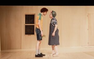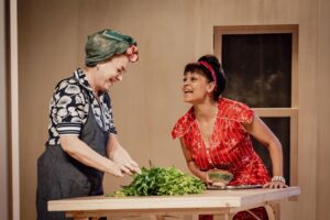 Ce frère écrit une pièce et comme dans les autres récits de Wajdi Mouawad la biographie s’entrelace, sa famille ayant fui Beyrouth pour raison de guerre. Une scène houleuse oppose père et fils à distance, ce dernier cherche la fin de sa pièce et raconte son cauchemar, il s’agit de violence et de massacre. À Beyrouth on rampe sous les fenêtres pour courir le moins de risques possibles. Les voisines à la curiosité aiguisée par le mariage, dont Souhayla (Bernadette Houdeib) proposent leurs services. Elles brûlent d’envie de rencontrer le fiancé. Le ton est celui d’une farce qui se balance entre comédie et tragédie. Jusqu’au pantalon de Neel pour la cérémonie, resté dehors sur le fil à linge, et qu’on ne peut aller chercher sans risque de recevoir un éclat de bombe.