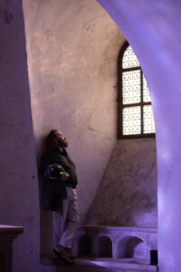 Ahmed El Attar, acteur, auteur et metteur en scène s’est formé entre l’Égypte et la France. Il dénonce l’occupation israélienne en même temps que le positionnement à l’extrême droite du Hamas et replace la Palestine dans son contexte historique. Pour lui, le geste artistique est en soi un acte de résistance, de même que toute tentative ou acte d’indépendance, dans un pays de gouvernance autoritaire où il faut apprendre à contourner la censure et à désamorcer les mécanismes d’autocensure. Il parle du festival qu’il a créé et dirige au Caire, D-Caf, plateforme internationale pour le jeune théâtre dont la 13ème édition se déroulera à l’automne prochain. Il tente, par la diversification de ses actions, de donner de l’espoir, des moyens et des outils aux jeunes créateurs de son pays, afin qu’ils créent des liens entre eux et cessent d’avoir envie de partir. En Égypte, plus de 60% de la population a moins de 22 ans rappelle-t-il. Il travaille sur la transmission et les résidences d’artistes, complémentairement aux textes qu’il écrit et met en scène. Pour lui Le geste artistique parle et doit rester humble, et il faut rassembler toujours plus de courage pour continuer à créer.