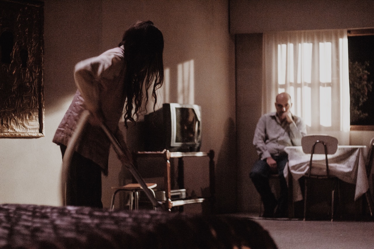On pénètre dans l’intimité d’une famille, l’intérieur est modeste, plutôt vieillot et dans un clair-obscur. Côté jardin un lit, une commode, côté cour une table et quelques chaises placées devant une fenêtre où, à certains moments, le rideau vole. Une vierge noire, orthodoxe, enchâssée de doré, est suspendue sur le mur et nous fait face. La télé est allumée, un vieux poste. Le père, et la mère qui plie du linge, sont assis devant. Vers le lit, une jeune femme, de dos. L’ambiance est lourde et l’ensemble silencieux.