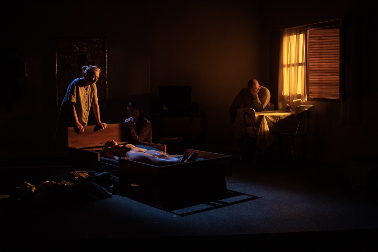 Le père positionne la commode au centre de la scène, pousse le linge posé dessus et nous place au cœur du sujet, la mort. Le meuble se déplie. À l’intérieur une jeune femme, nue et immobile. L’image est impressionnante et le spectateur se doit de construire son propre scénario tout au long du spectacle, de reconstituer la famille pour faire le lien entre les images proposées et qui s’inscrivent entre la vie réelle et réaliste, le mystique et le fantastique, le symbolique.